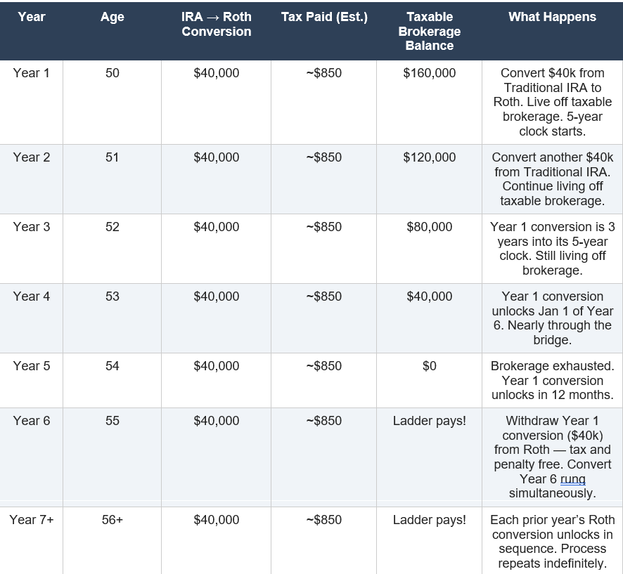 But for someone who followed the more common path of maximizing tax-deferred accounts throughout a career with limited taxable savings, the Roth conversion ladder is not optional. It is the primary mechanism for accessing your own money without paying a penalty for retiring too early.
