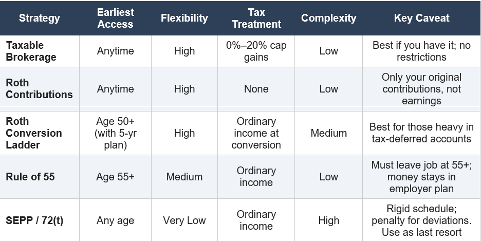 For someone planning to retire at exactly 55, this can be a clean and simple solution. You still owe ordinary income tax on distributions, but the 10% penalty disappears. If you are retiring earlier than 55, you will need one of the other strategies to bridge the gap.